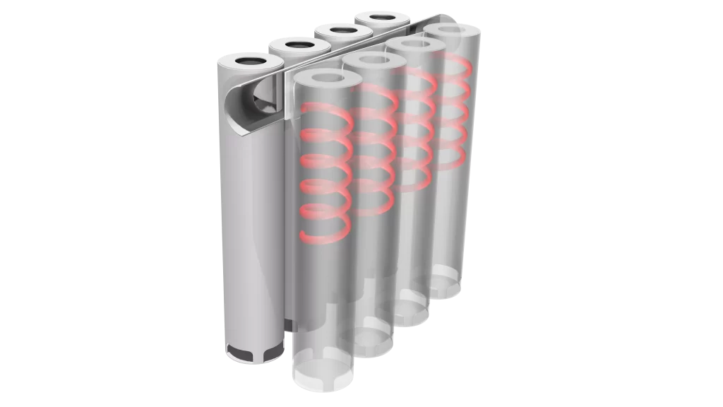 Utilizing an internal piping system to control and achieve velocities, your process stream will enter into the tubes of the cluster through a large tangential gap. This induces a tornado within the controlled environment that mechanically forces the heavier liquids to the wall of the tubes while the gas rises through the low-pressure core and exits via the vertical section. An internal baffle system ensures equal distribution across all tubes.